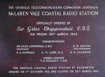 About the time that the new transmitter was delivered improved receiving apparatus was provided. Regenerative type receivers made by AWA were put into operation and together with the transmitters the new facilities resulted in a great improvement. In 1927 Beam Wireless equipment was installed at Rosewater during November and a 5kw transmitter operated on wavelengths of 17.36, 19.88 and 50 metres. A radiotelephone service from VIA with small ships belonging to the Adelaide Steamship Co. was inaugurated during August 1929. The first ship fitted with wireless equipment was the "Mulcra" and service started with her on the 17th August. Service was conducted initially on wavelengths of 800 to 200 metres. During May/June 1937 arrangements were made for Parafield airport to use the facilities at VIA for direct two-way communication with aircraft. Equipment to allow this form of communication was installed at VIA and connected by landline to Parafield. In 1945 a Commonwealth Telecommunications Conference was held in London and decision was made that each of the Commonwealth countries should assume public ownership of radio and cable installations and services in its own country. In June the following year the Australian Government gave expression to this agreement and created a new corporate body, the Overseas Telecommunications Commission (Aust) to be responsible for the maintenance and operation of telecommunications services between Australia and other countries, with ships at sea and between Australia's external territories. The Government on 1st October 1946 purchased the coastal radio stations and services from AWA. Under a Caretaker and Management Agreement, the company continued to operate the services on behalf of OTC for some four months whilst the new Commission completed its organisational arrangements. OTC assumed full control of the radio services on 1st February 1947. Most of the company's staff at the coastal stations transferred to similar positions in the new organisation so that the stations continued to be manned largely by the same people. During 1947 facilities were introduced at all coastal radio stations to provide radiotelephone communication with small ships in Australian coastal waters. This small ships service was still operating in 1993 making possible the exchange of telegrams in addition to providing a vital SOLAS (Safety of Life at Sea) service. Initially only one frequency was used for this service. Later, all stations, in addition to the international distress frequency 2182 kHz, employed three frequencies in the 2, 4 and 6 Mhz bands. VIA kept a continuous loudspeaker listening watch on three frequencies including the distress frequency. Weather reports and navigational warnings were broadcast on two of these frequencies. Local noise and interference became a major problem at the original site due to industrialisation of the area and in 1952 some of the Rosewater receiving facilities were transferred to Brighton. The receivers and antennas were located in the yard of Minda Home, Brighton and the receivers were remotely controlled from Rosewater. Signals were fed over telephone pairs to the operating position. A small concrete building housed the receivers and a buried copper plate was put down for an earth system. In 1963 a new coast station centre was established at McLarenVale some 40km south of Adelaide on a site of about 66 acres. The rapid industrialisation of the Rosewater area had increased electrical interference to the point where a move to a new site became imperative. The time was opportune too, to increase the power of the main transmission and to provide added and more modern facilities. The McLarenVale site was chosen because it was within reasonable distance of Adelaide; it was protected by land barriers unlikely to be developed industrially and therefore relatively immune from electrical interference and the site was adequate for all transmission and reception facilities as well as for future expansion. The station was the first of a new style in Coastal Radio Service facilities. Five new houses of attractive design were built in the McLarenVale district to accommodate staff. Sir Giles Chippandall C.B.E. officially opened the station on 29th March 1963 before a small gathering of distinguished guests. |