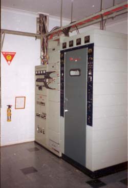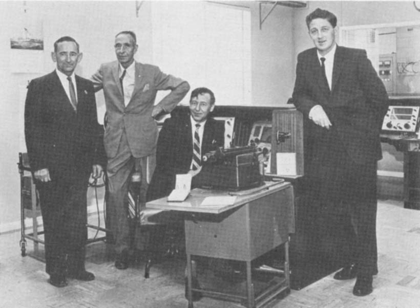 Operating room, consoles line astern. Power unit, Antenna patching and CTM-2k Tx can be seen through window in TX room. Max Lang seen near camera & Denis Maher on W/T point. |
