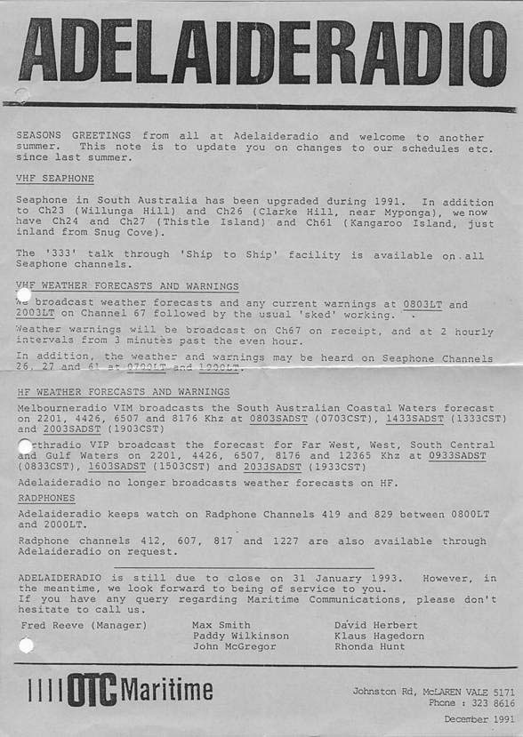 The document below was distributed to yacht clubs, volunteer rescue squadrons and retailers in the boating industry and is how the new owner became aware that AdelaideRadio was closing down |